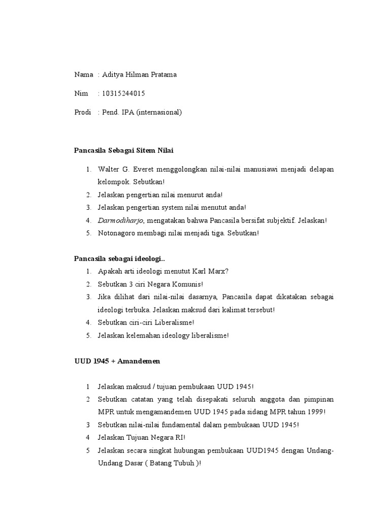 Soal Dan Jawaban Uts Mk Pancasila Prodi Adm Negara Semester Ganjil